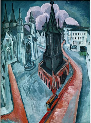 En una primera visió, el quadre ens mostra una ciutat. Al centre del quadre podem veure un edifici principal, que destaca per la seva grandària i el color negre. Al voltant, una plaça que està rodejada per més edificis. Podem veure una gran perspectiva on l’espectador està observant des de dalt. Aquesta perspectiva ens proporciona molta profunditat. Els edificis estan formats per angles i línies molt inclinades característic de l’expressionisme alemany i amb sostres punxeguts. Pel que fa als colors, està format per colors fred, blaus menys per la carretera o camí i la base de l’edifici central. El quadre està pintat amb pinzellades que l’autor deixa quan fa els canvis de colors. Al fons de la imatge podem veure uns núvols amb tons violetes que destaquen per les formes arrodonides en comparació amb tots els angles dels edificis. Aquesta perspectiva transmet serietat i tenebrositat a l’espectador.